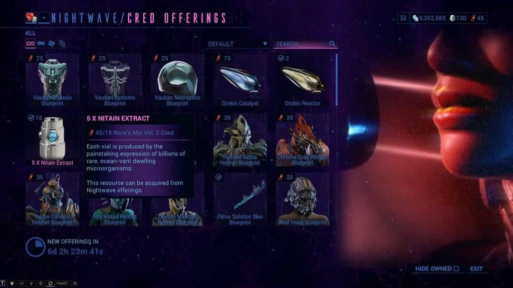 Nightwave — это своего рода боевой пропуск в Warframe. Вам нужно повышать свой ранг, чтобы зарабатывать WolfCreds. Достигнув 15-го ранга, вы сможете приобрести как минимум один набор из 5 экстрактов нитейна. Как только у вас будет достаточно WolfCreds, вы сможете обменять их на этот ресурс. Самое приятное, что можно купить сразу несколько наборов!