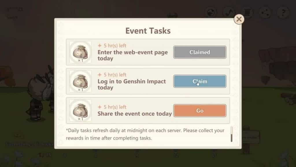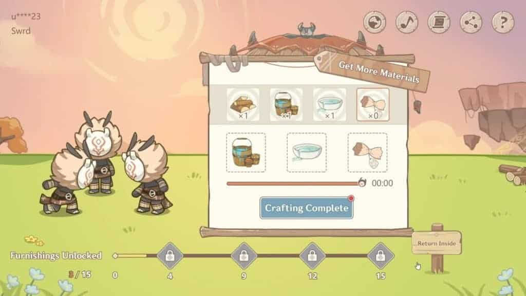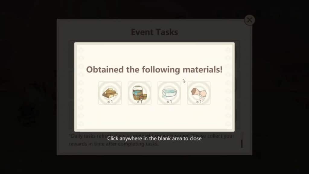 Вы можете ежедневно накапливать материалы, выполняя три действия, знакомые по предыдущим браузерным событиям Genshin Impact: войдите в игру, посетите таверну и поделитесь событием с друзьями. Для создания нового предмета мебели вам понадобятся только дерево, чаша, ведро и солома.